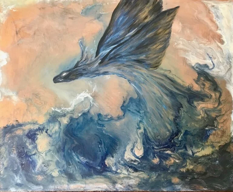When I got back to my studio – I played around with pouring – and this is where the painting took me! I call it “The Water Dragon”. It’s Acrylic & Copper Leaf on a Wood Panel that is 50 x 40cm.